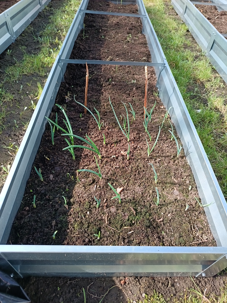 А на улице взошёл посаженный ранний чесночек. Посадили специально два сорта. Один ранний, что бы малосольные огурчики делать, а другой поздний.
