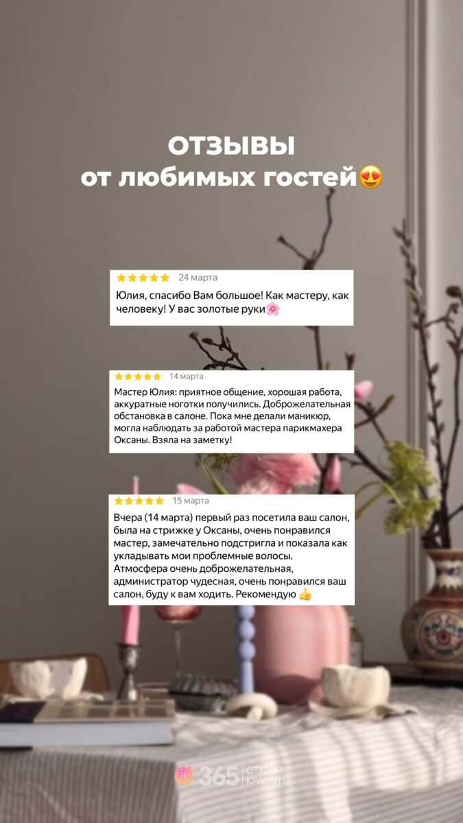 Ваши слова - это то, что вдохновляет нас каждый день 🤍 В них - доверие, эмоции и та самая обратная связь, ради которой мы стараемся ещё больше. Спасибо, что выбираете студию 365 и делитесь своими впечатлениями ✨