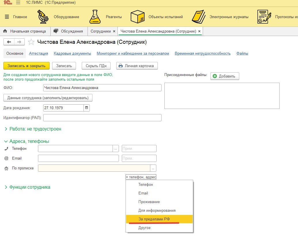 Как в LIMS сделать адрес по прописке за пределами РФ ❓Был вопрос недавно от клиента, по этому решили тут поделиться. 🧐Адрес по прописке за пределами РФ. Когда вносим адрес сотрудника он проверяется по ФИАС и система не дает записать адрес если он не прошел проверку. Загрузка классификаторов не помогает т.к. в ФИАС только РФ. Для внесения адреса за пределами РФ нужно добавить другое поле адреса, см. на картинке выше. Это типовой функционал. 🤔В LIMS IT-LAB есть много интересных решений в самой поставке, без всяких доработок. Если возникли вопросы обращайтесь к нашим специалистам. Хотите посмотреть демонстрацию? Обращайтесь к нашим специалистам info@it-lims.ru