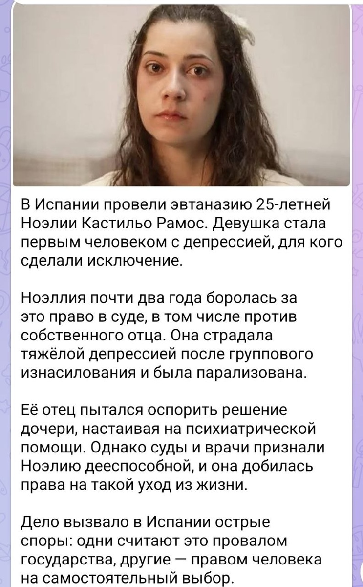 С одной стороны, я за признание права человека на смерть и против присвоения жизни человека государством. С другой стороны, задаюсь вопросом, действительно ли все было так безнадёжно? 🤔 Нельзя не думать о возможножных махинациях в связи с распространением эвтаназии, а такие случаи могут колыхнуть чашу весов в любую сторону. Что думаете вы об этом случае и об эвтаназии в целом? Интересно узнать ваше мнение 🙏