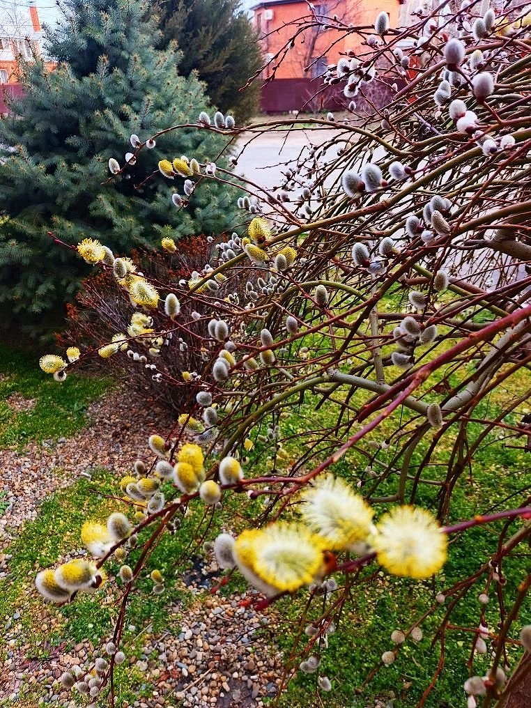 Повсюду набухают почки, появляются робкие листочки, а верба стоит в своём пушистом убранстве — будто город надел праздничные серёжки.