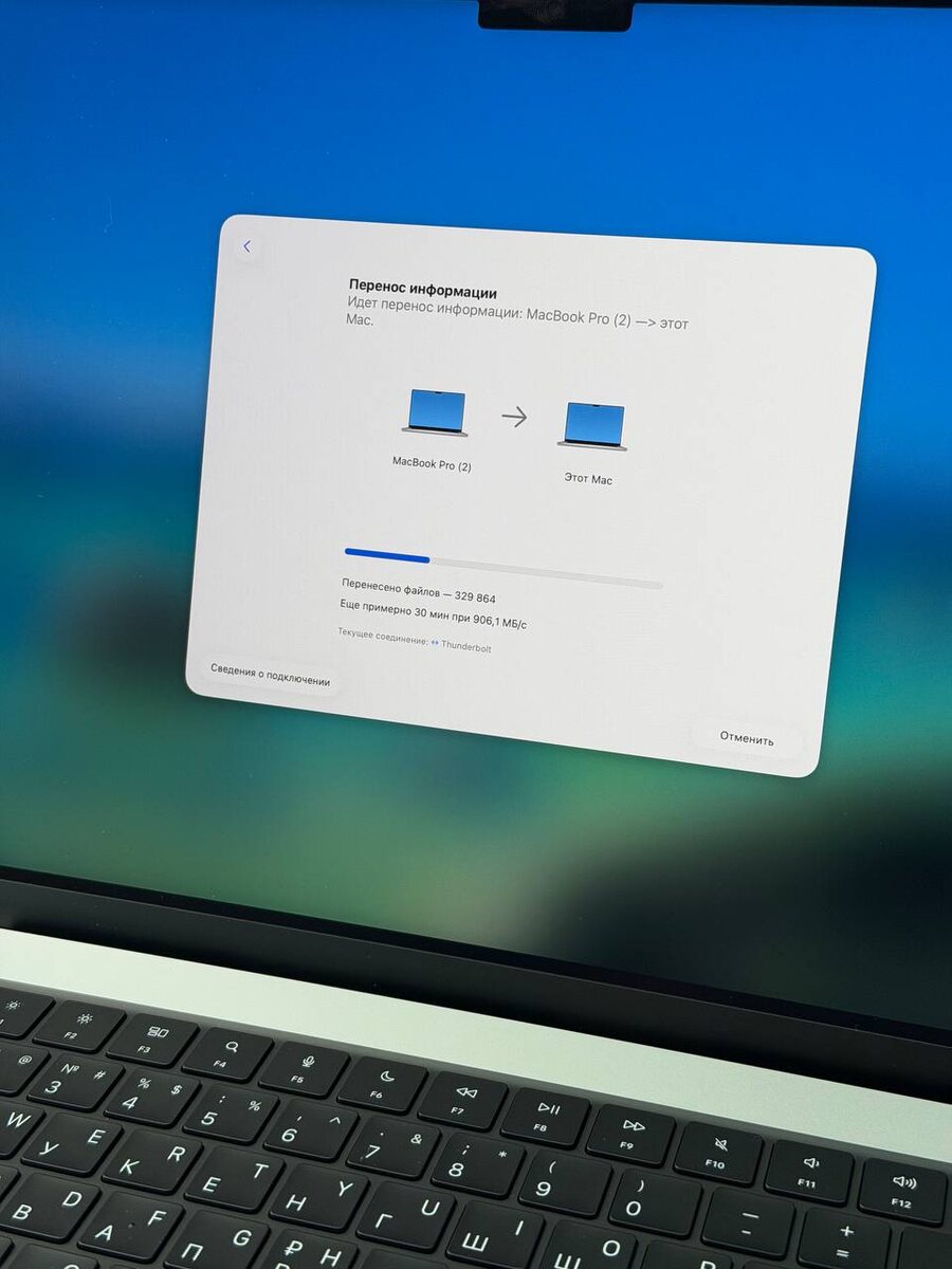 При переносе данных с Mac на Mac используйте Thunderbolt В MacBook установлены Thunderbolt это безумно быстрые порты. Кабель стоит не мало, около 20 000₽, но он есть в комплектации с Studio Display. 1.5 Тб за 30 минут. 28 если быть точным. В итоге разогнался.