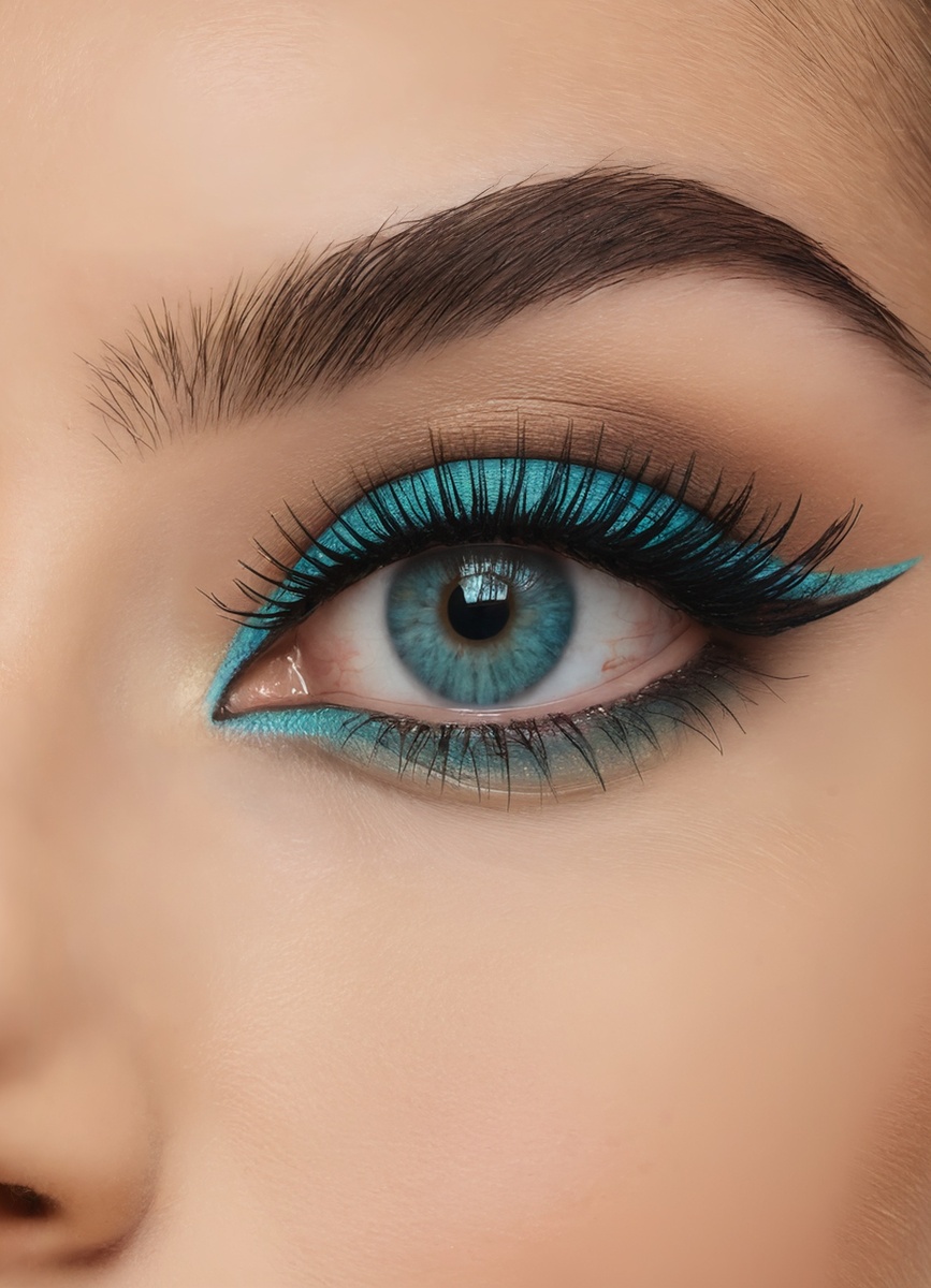 Для более смелого варианта попробуйте создать эффект «кошачьего взгляда» с помощью бирюзовой подводки. Нанесите ее на верхнее веко, слегка приподнимая к виску, и дополните образ нейтральными тонами в остальном макияже. Бирюзовая подводка отлично сочетается с коричневыми или бежевыми тенями, создавая гармоничный и в то же время запоминающийся образ. Такой подход легко адаптировать для повседневной жизни, добавляя каплю креативности в привычный макияж.