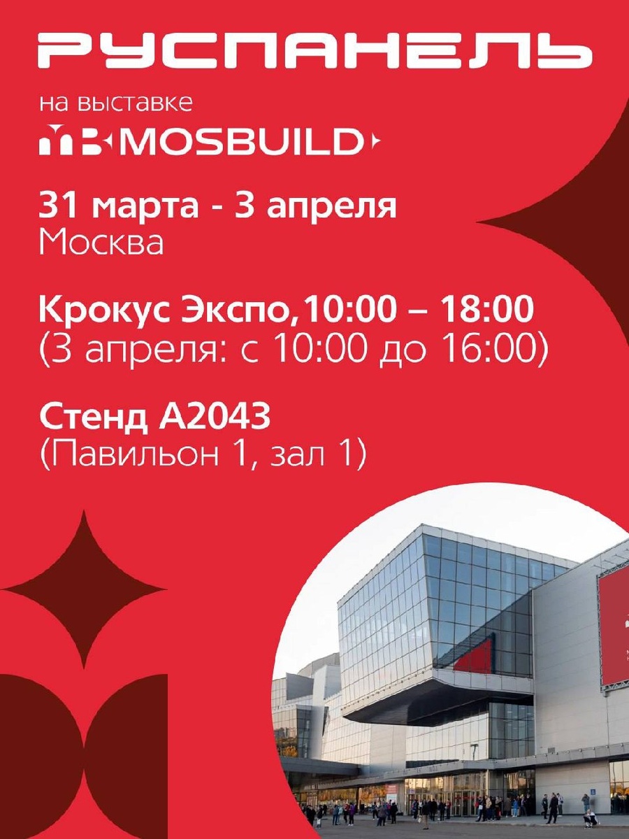 !🧡 Уже совсем скоро стартует 31-я строительно-интерьерная выставка MosBuild🔥 Команда Руспанель активно готовится к встрече с вами – будем рады пообщаться, показать наши решения и обсудить новые проекты😎 📅 31 марта – 3 апреля 2026 📍 Крокус Экспо, Москва Павильон 1, зал 1, стенд A2043 🕓 10:00–18:00 (3 апреля — до 16:00) ➡ Получить билет Промокод: mbw26eURAP