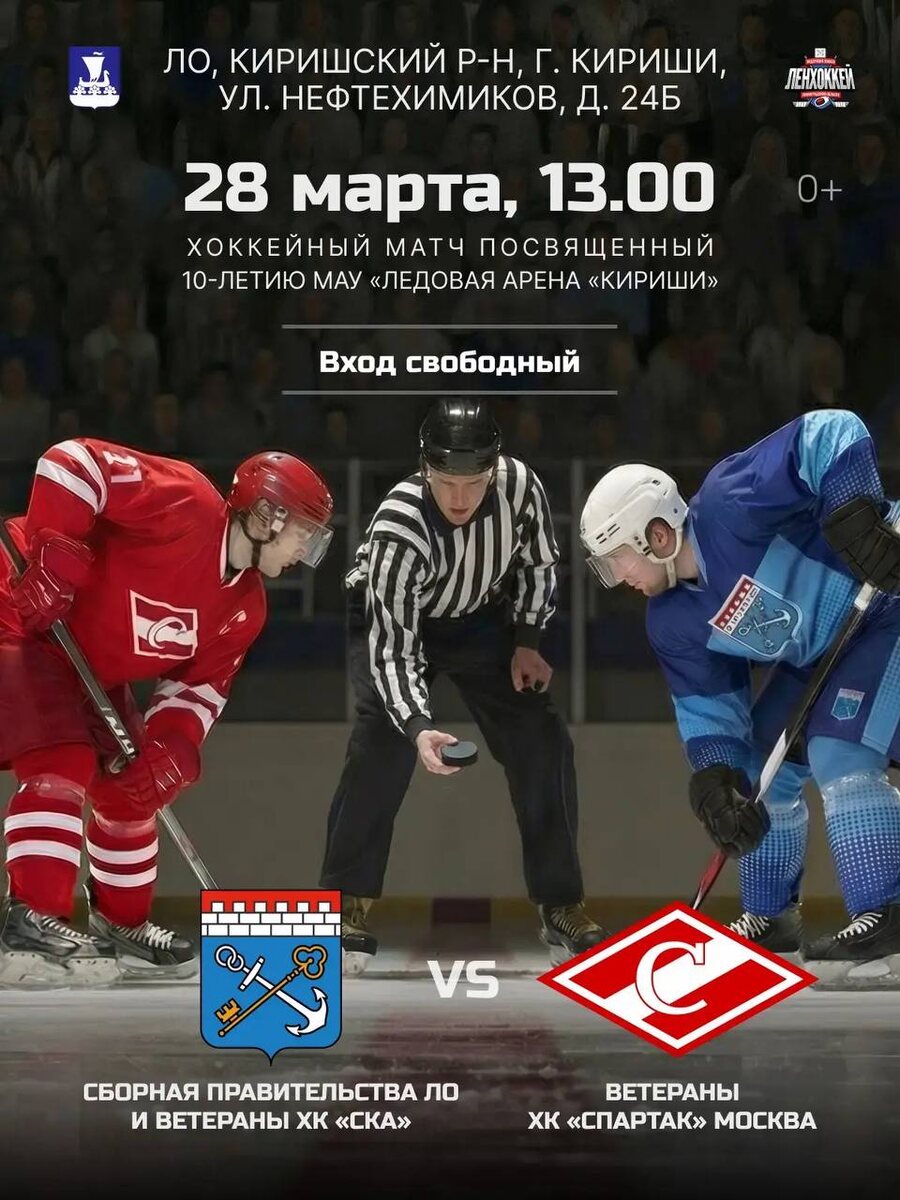 ! Сегодня этот город принимает знаковое хоккейное событие. Это не просто матч — это большая битва на киришском льду! 🇷🇺 На арене сойдутся мощь и опыт двух главных хоккейных центров страны: Санкт-Петербург и Ленобласть: В едином строю выступят Команда Правительства Ленинградской области и прославленные ветераны «СКА» 💥💥💥 🆚 Москва: Против них на лед выйдет легендарная команда ветеранов московского «Спартака»! 💥💥💥 Это будет легендарное противостояние: классика русского хоккея, мастерство звезд мирового уровня и невероятный накал страстей. У вас есть уникальный шанс увидеть кумиров поколений в деле и поддержать команду нашего региона в этом «дерби столиц»! 📍Где: Ледовая арена «Кириши» 🔜Когда: 28 марта, в 13:00 Не упустите этот шанс! Берите друзей, семьи и приходите за настоящими эмоциями. Встречаемся в Киришах в 13.00! Такое нельзя пропустить! 🏆