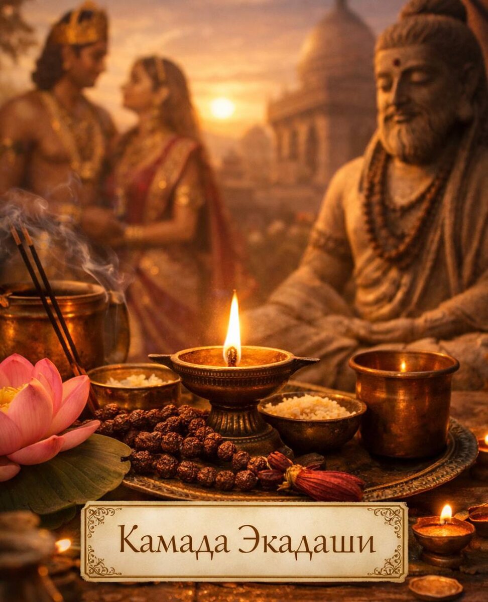 Камада Экадаши - священный день, приходящийся на растущую фазу Луна. В древних писаниях рассказывается следующая история (погрузитесь в нее, ведь не зря она передается из века в век): Давным-давно был город Ратнапура - богатый, сияющий золотом и драгоценностями. Им правил царь Пундарика. Среди жителей были небесные существа - гандхарвы. И среди них Лалит и его жена Лалита. Они любили друг друга по-настоящему. Настолько, что не могли даже на мгновение забыть друг о друге. Однажды Лалит пел при дворе царя. Но его мысли были не там… он думал о своей жене. И из-за этого сбился с ритма. Царь разгневался. И в порыве гнева проклял его… Он превратился в ужасного демона-людоеда. Представь… ещё вчера прекрасный небесный певец. А сегодня существо, от которого все в ужасе. Но самое страшное не это. Самое страшное видеть, как страдает любимый человек… и не знать, как помочь. Лалита не оставила его. Она шла за ним через леса, через страх, через боль… И однажды встретила мудреца. Он сказал ей просту