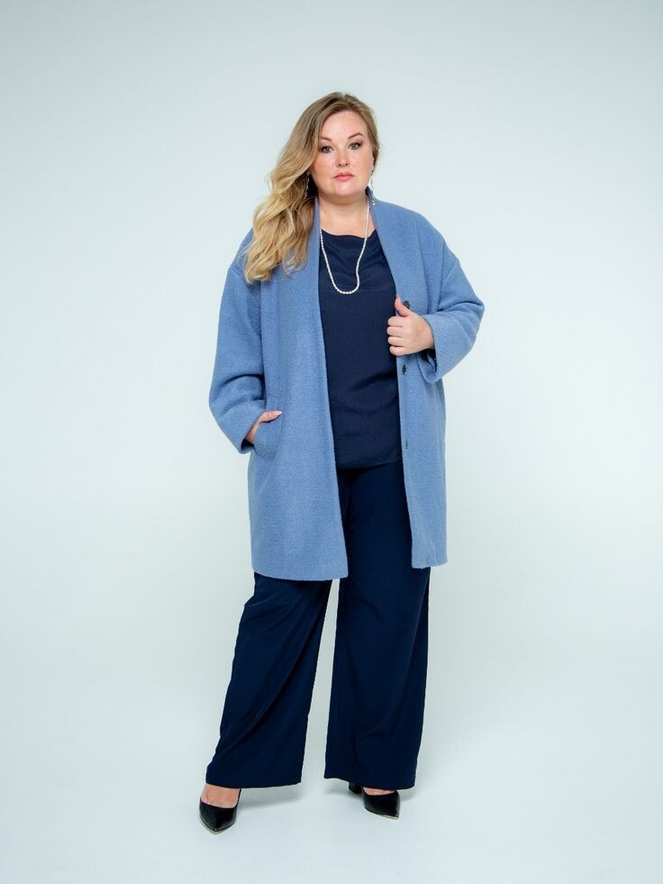 В этом образе сочетание синего и голубого цвета создаёт вертикаль, которая вытягивает фигуру модели, делая её стройнее.Важное дополнение бусы и туфли на удобном каблуке вытягивают силуэт.