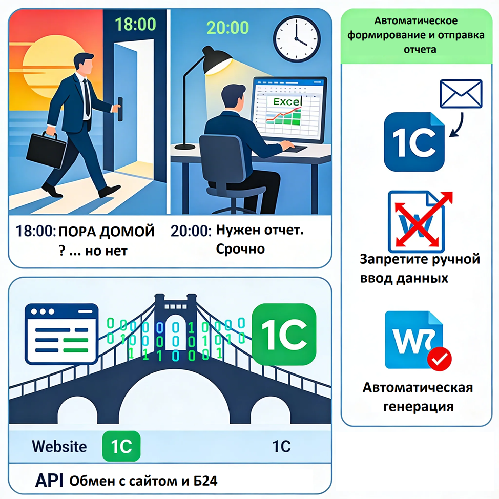 Вы —руководитель малого или среднего бизнеса. У вас всё под контролем: продажи растут, процессы налажены. Но вы замечаете пробелы: данные разрознены по системам, отчеты собираются вручную часами, а ключевые цифры недоступны мгновенно. В результате вы теряете время на ожидание, а сотрудники выгорают на рутине. Как раз в этом вам может и помочь автоматизация. Важно, не то, что вам нужны какие-то доработки просто так. Важно, чтобы эти доработки в 1С приносили отдачу. К примеру, ваш сотрудник сводит разные цифры в один отчет в эксельке. Экономьте время и берегите сотрудника – закажите разработку нужно отчета для 1С, пусть цифры собираются автоматически. К примеру сотрудник задерживается на работе каждый день до 20 вечера, для того чтобы после рабочего дня 18-00 --- взять нужные цифры собрать их в эксельку – и отправить вам как руководителю на почту. Согласитесь что возможно его тоже как и вас ждут дома)). Формирование отчета в конце дня и автоматическую его отправку на почту – можн