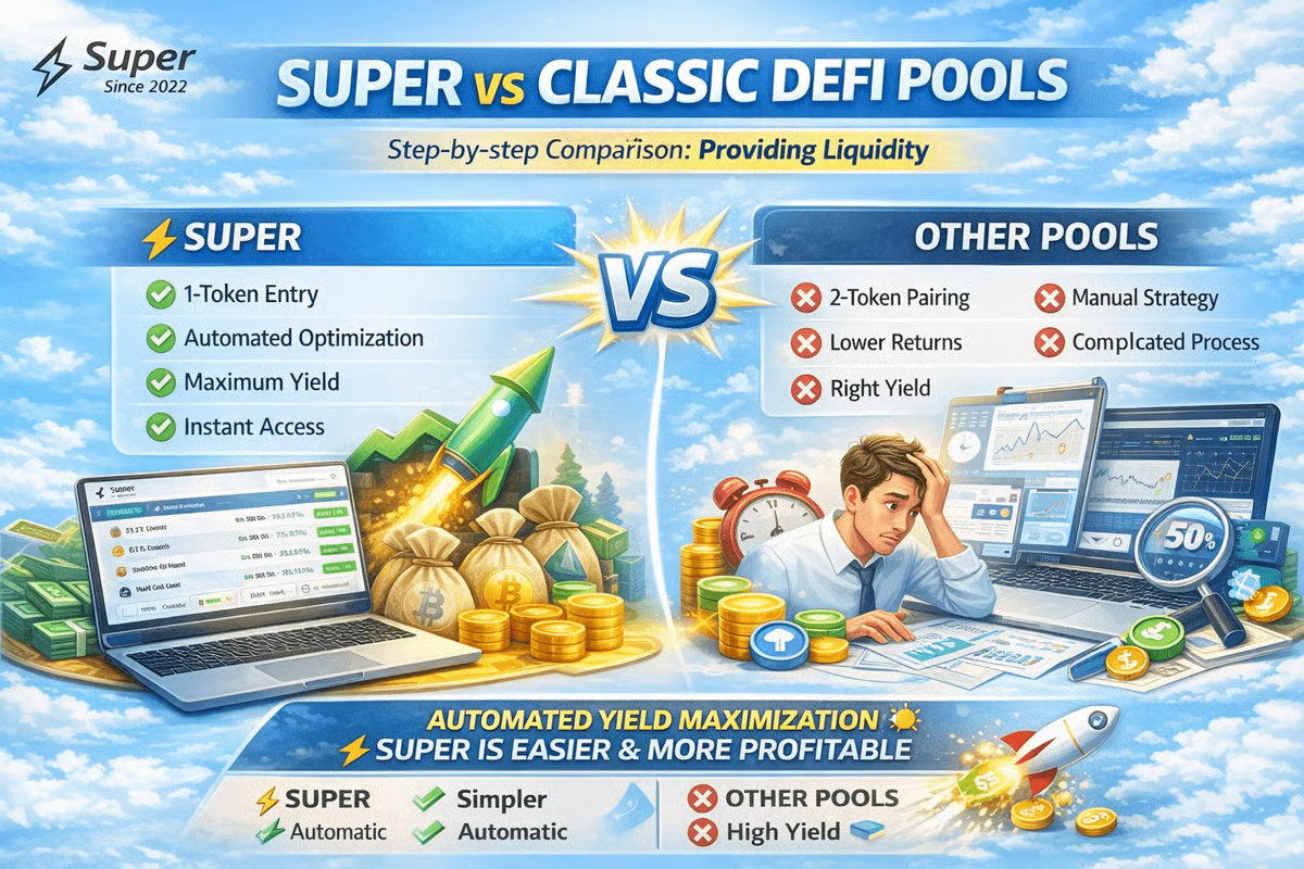 Если ты новичок, главное отличие между Super и классическими DeFi-протоколами — это сложность входа. Ниже — честное и наглядное сравнение, как происходит размещение токенов: 👉 app.superearn.com 👉 1 клик 👉 просто список с APR 👉 например USDT 👉 ты уже зарабатываешь 👉 на сайт другого defi протокола 👉 например ETH + USDT 👉 иначе не получится внести ликвидность 👉 без этого не будет дохода 👉 процесс сложный и требует понимания рынка 👉 Основная причина — архитектура пулов 👉 особенно в новых версиях DEX 👉 при этом Super постоянно анализирует рынок и переносит ликвидность туда, где доход выше, что позволяет: Основные ошибки: ❌ неправильная пара токенов