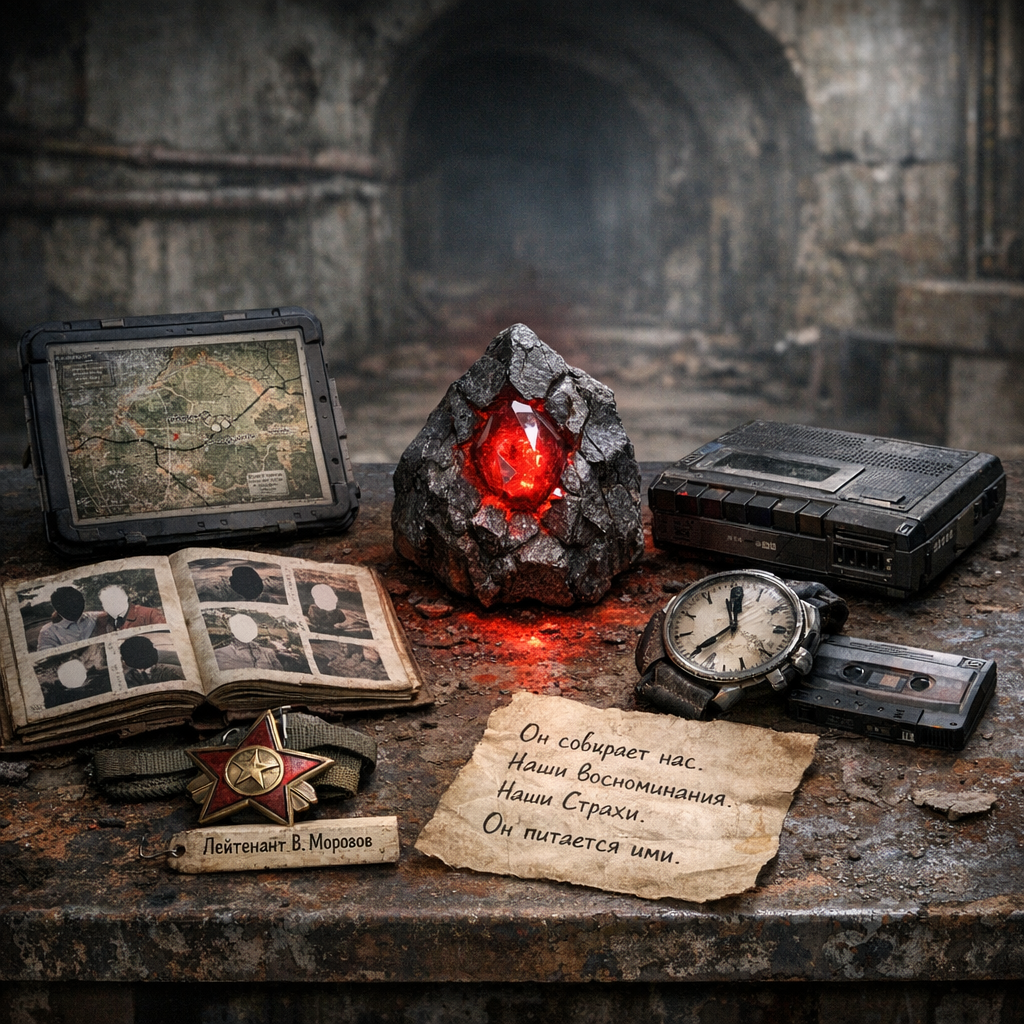 Комбинезон «СЕВА», порванный в нескольких местах, но с сохранившимся пси‑фильтром. Фонарик «Луч» с потускневшим стеклом — когда Плесень нажал кнопку, он мигнул и погас.Блокнот с записями — страницы были испещрены хаотичными заметками: «Он шепчет… Я вижу их… Они все здесь…». Последняя запись: «Он придёт за мной сегодня».