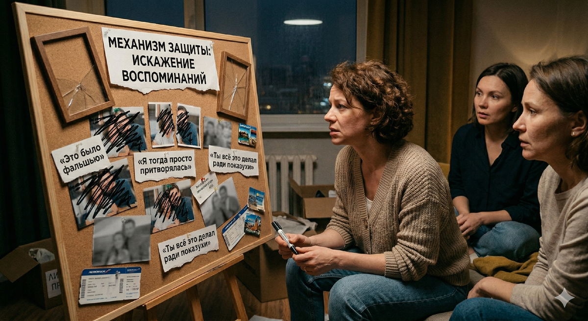 Развод — это не только юридический процесс раздела имущества, но и радикальный пересмотр общего прошлого. Часто мужчина с изумлением обнаруживает, что годы, которые он считал стабильными и счастливыми, в устах бывшей супруги превращаются в «беспросветный период подавления». Этот феномен в психологии часто называют ретроспективным обесцениванием. Чтобы оправдать текущую агрессию, отчуждение ребенка или жесткие требования в суде, человеку необходимо создать фундамент из «прошлых ужасов», даже если они конструируются прямо сейчас, задним числом. 1. Механизм «Черного фильтра» и эмоциональный ревизионизм Когда отношения заканчиваются болезненно, психика включает защитный механизм: она стирает или искажает позитивные воспоминания. Общие праздники, поддержка в трудные времена, совместные путешествия — всё это обесценивается фразами: «Это было фальшью», «Я тогда просто притворялась» или «Ты всё это делал ради показухи». • Зачем это нужно: Это способ снять с себя ответственность за разрушение с