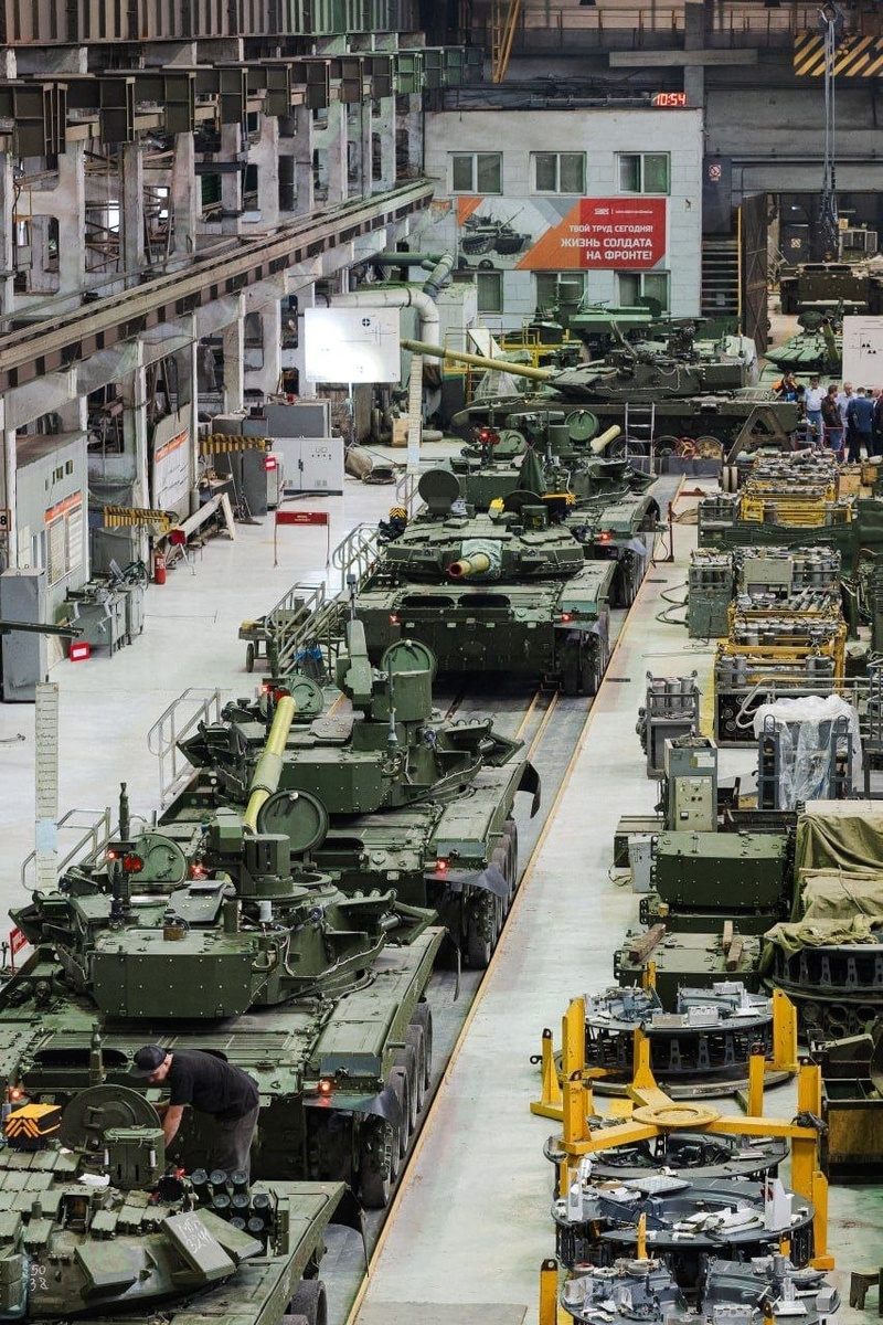 На представленных кадры осуществляется сборка танков Т-72Б3М и Т-90М. В условиях ограниченности использования танков (да и вообще тяжëлой бронетехники) на поле боя в зоне СВО свежепостроенные боевые машины как правило находятся в резерве и не несут при этом тяжëлых потерь. https://dzen.ru/id/6425916a1950720421f18802