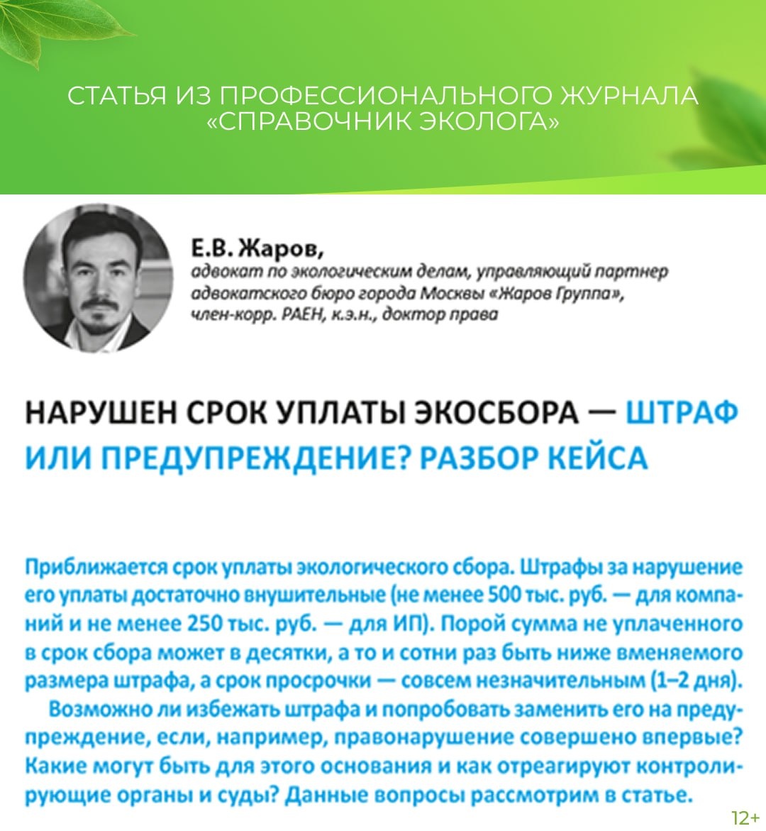 неуплате экосбора в том числе за предыдущие отчетные периоды, важно владеть аргументами для возможных споров с надзорными органами, которые могут выбрать штраф вместо предостережения (для первого случая невыполнения обязанности по РОП) Управляющий партнер адвокатского бюро города Москвы «Жаров Группа» Е.В. Жаров приводит такие аргументы, которые многим природопользователям могут помочь сохранить средства, переведя вопрос из плоскости штрафа в предостережение. Подписаться на «Справочник эколога»