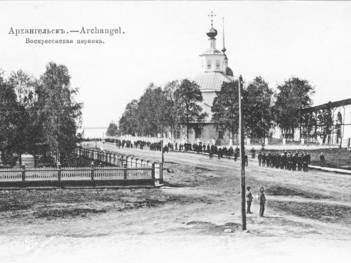 Эта длинная, прямая и широкая улица – практически проспект Сегодняшнее название её – историческое, по названию церкви, когда‑то стоявшей на набережной возле Гостиных дворов. В 1929 году церковь снесли, а улицу переименовали в улицу Энгельса ещё в 1920 году. И такой она была до 1993 года, когда ей вернули историческое название, хотя к тому времени от историзма на ней ничего не осталось. Теперь уже невозможно представить Воскресенскую обычной улицей деревянного города начала XX века, настолько она изменилась. Поворотным моментом в её судьбе стал железнодорожный мост через Северную Двину. Тогда вдали от города, на Мхах, на оси улицы Энгельса, был построен железнодорожный вокзал, и улица и вместе с ней город потянулись к нему, буквально по смыслу латинского термина prospectus (вид будущего, вид развития, проектирование будущего), сначала деревянными мосточками, а потом хрущёвскими каменными домами, которые теперь у Обводного канала. Сегодня протяжённость улицы составляет около трёх километ