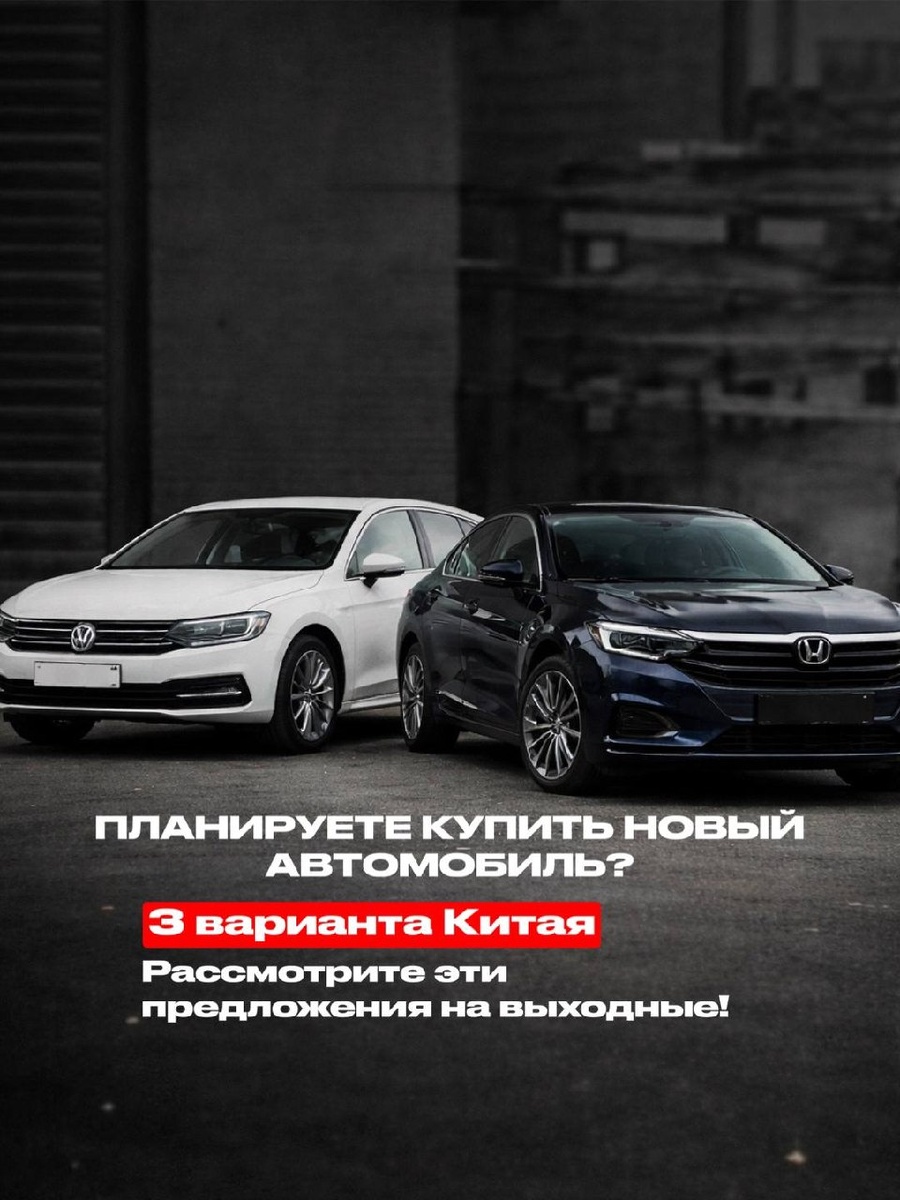 бюджет до 1,5 миллионов рублей, которые спокойно проходят и их можно приобрести под ключ, конечно же, это #Китай 👇 Выгодные предложения этих выходных: 🚘 Volkswagen Lavida Этот стильный седан подходит для тех, кто ищет баланс между комфортом и экономией на топливе. Отличная надежность и современный дизайн, который не теряет актуальности. Год 2022 Пробег 40 000 км Объем 1500 см³ Мощность 112.85 л.с. (83.0 кВт) 💵 Цена 1 410 209 ₽ 🚘 Honda Crider Свежий автомобиль с малым пробегом, идеально подходит для города. Легкость в управлении, отличная экономичность и японская надежность в одном флаконе! Год 2023 Пробег 11 000 км Объем 1000 см³ Мощность 122.37 л.с. (90.0 кВт) 💵 Цена 1 545 118 ₽ 🚘 Wuling Capgemini Идеальный вариант для тех, кто ищет универсальность и высокую мощность в сочетании с доступной ценой. Хорошее предложение для городской и загородной езды! Год 2021 Пробег 60 000 км Объем 1500 см³ Мощность 146.84 л.с. (108.0 кВт) 💵 Цена 1 348 891 ₽ ⚡️ Эти автомобили — отличный вы