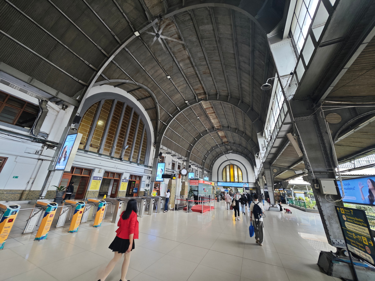 Местные называют этот вокзал Beos. Сначала я было думал, что это просто название района, но оказалось, всё интереснее. Существует несколько версий происхождения этого имени. Одна из них — Bataviasche Ooster Spoorweg Maatschappij (BOS), что переводится как "Батавская восточная железнодорожная компания" . Именно она когда-то владела станцией, стоявшей на этом месте раньше. Другая версия — Batavia En Omstreken, то есть "Батавия и окрестности" — название, отражающее роль вокзала как транспортного сердца города.Название прижилось настолько, что даже в 1980-е годы его продолжали использовать . А официальное имя — Stasiun Jakarta Kota — появилось позже. Главный фасад встречает гигантскими арочными окнами — лунетами — которые пропускают внутрь потоки света. В центральном зале я задираю голову и вижу свод barrel-vault — огромные стальные арки, заказанные прямо из Нидерландов. Такие дела.