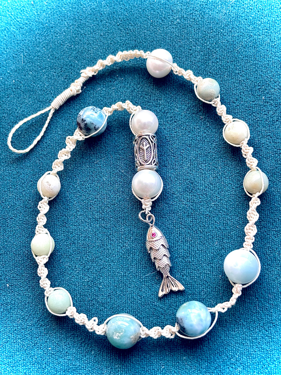Это сакральное украшение Лула (вплетаемое в волосы для усиления связи с интуицией) набор камней :Ларимар, Жемчуг,Амозанит .