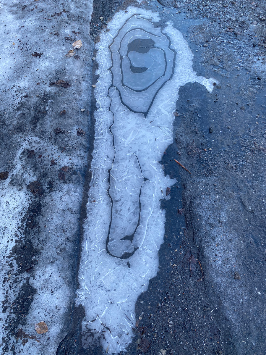 Утром мы встретили много дивных, покрытых льдинками луж. Лужи разнообразные по форме, по фактуре, по цвету, по узорам.