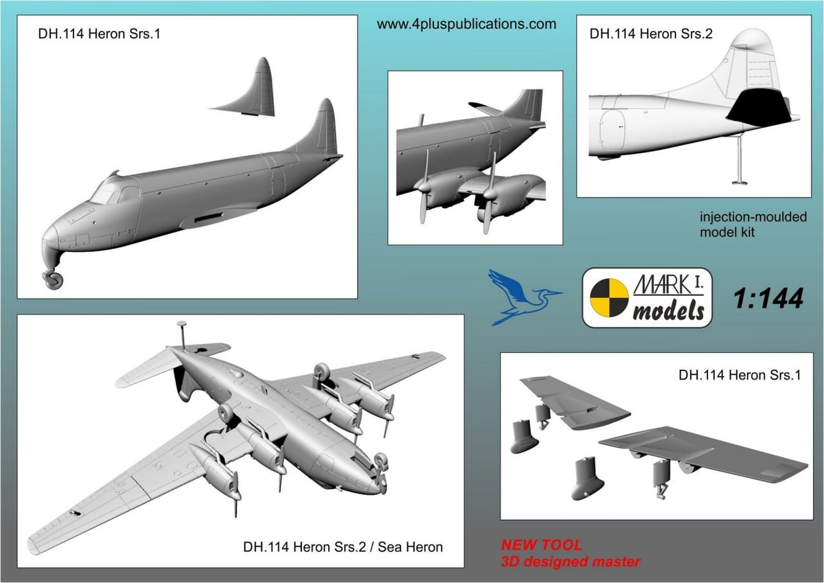 Будут доступны следующие варианты: MKM144190 DH.114 Heron/Sea Heron 'Military Service' MKM144191 DH.114 Heron Srs.1 'BEA, Mercury, Sabena' MKM144192 DH.114 Heron Srs.1 'Dan-Air, Silver City, Southern' MKM144193 DH.114 Heron Srs.2 'Dragon, Südflug, Itavia' MKM144194 DH.114 Heron Srs.2 'Martin's Air, Fiji, Heron'