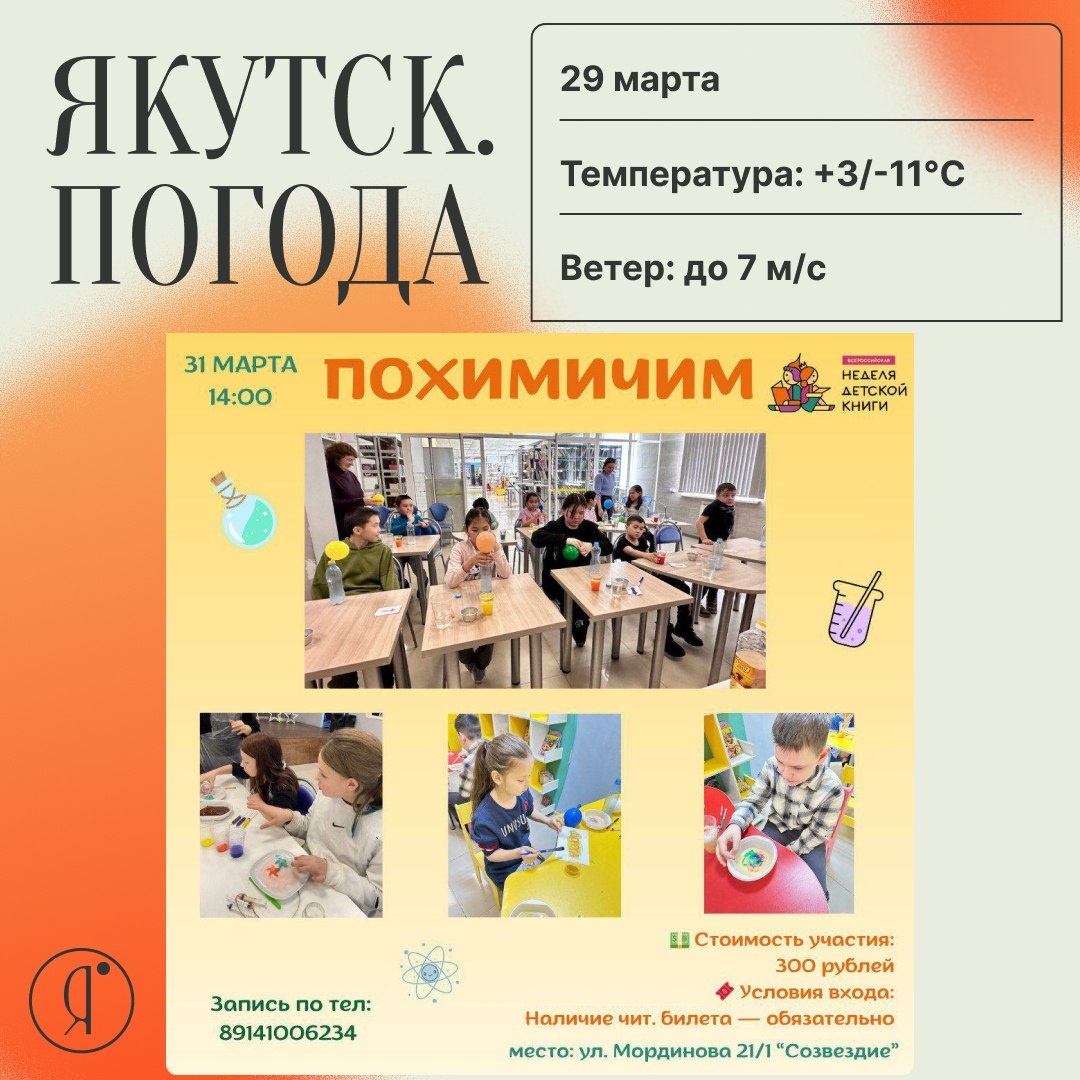 Дети смогут почувствовать себя настоящими исследователями: ✨ провести зрелищные и безопасные опыты ✨ узнать удивительные законы природы ✨ открыть для себя захватывающий мир естественных наук 💵 Стоимость участия: 300 рублей 🎟 Условия входа: Наличие чит. билета обязательно 📞 Запись по телефону: +7 (914) 100-62-34 🗓 31 марта с 14:00 📍 Библиотека "Созвездие", ул. Мординова 21/1 Online Якутия | Ждем вас в МАХ