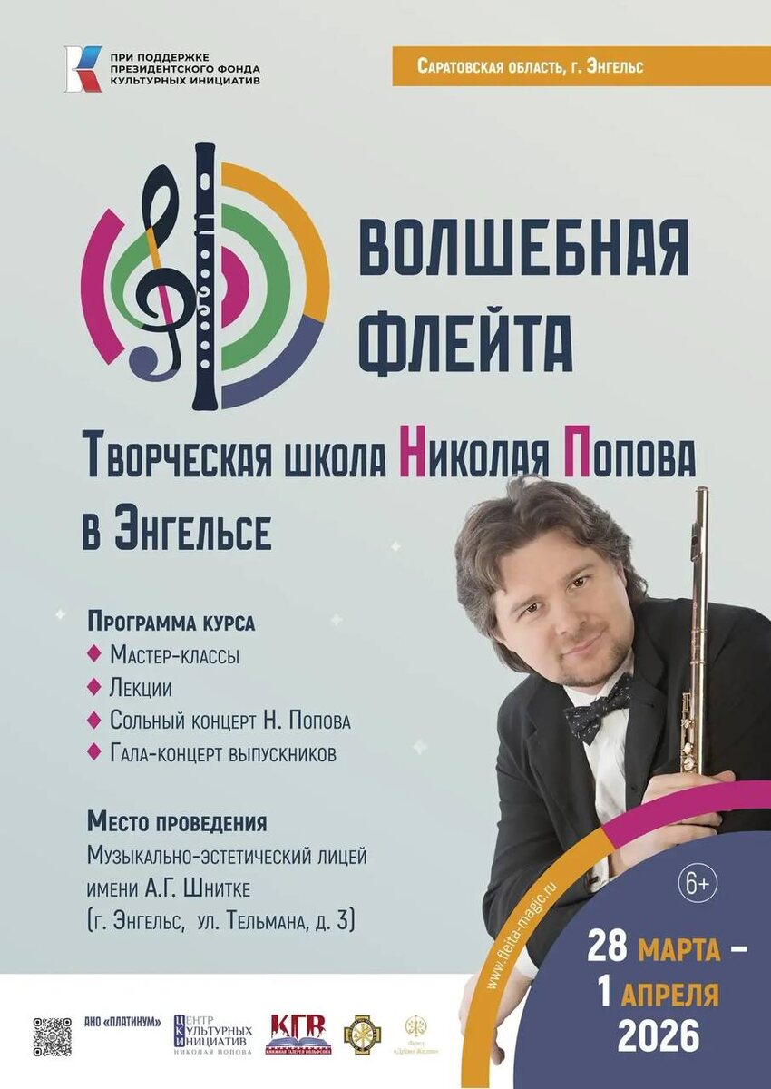 , в рамках Межрегионального проекта «Волшебная флейта. Творческая школа Николая Попова» При поддержке ПФКИ Волшебная Флейта. При поддержке ПФКИ Наши партнеры: МФЦ и создатели главного приза проекта - серебряной флейты «Соловей» Гончаров ; Музей Просвещения ; Фонд «Древо жизни». Вся информация о проекте в нашей группе и в телеграм-канале, а также на сайте. #ВолшебнаяФлейта #ТворческаяШкола #НиколайПопов #волшебная_флейта #флейта #МузейПросвещения #императорскаяфлейта #флейтаНиколаяII #Энгельс #Саратов