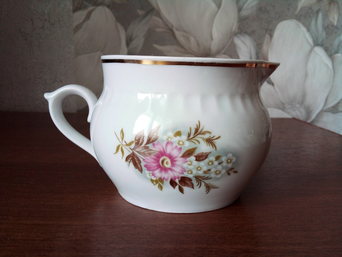 Большой блошиный рынок, который знают все, находится на другом конце города. Но у меня в двух пеших остановках есть маленький "филиал". Предпринимала пару попыток летом сходить, но как-то было никак. И людей мало, и красивого ничего. Но мне же интересно. И рядом, даже ехать не надо. Субботним утром как-то неожиданно сорвалась. Одежда и всякие мелочи меня не интересовали. А вот посуда.... Но главное - держать себя в руках))) Сначала мне встретился мужик с настоящим чашками и блюдцами Дулёво по 350 рублей. Это вообще не цена для этого. Но у меня был спортивный интерес. И вот первая любовь - молочник. Впервые вижу такой молочник с широким горлышком. Мне кажется, в него не только наливать, но и что-то складывать можно - творог, ягоды. Мне красиво. Цена - 100 рублей. Фарфоровый завод "Пролетарий" , ближе к 90-м годам. Давно хотела кофейную чашку чуть меньше моей обычной. И примерно такой формы. А тут она. За 50 рублей. Взяла и пошла нафиг оттуда)))) Чашка из Китая, возможно, это подделка по