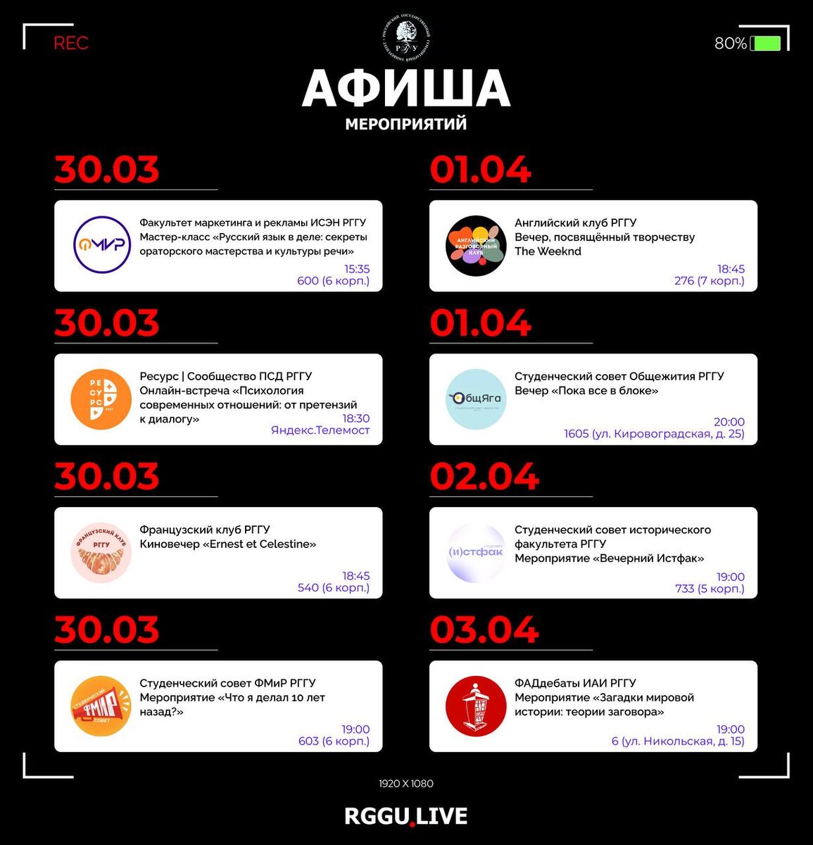 📢 Факультет маркетинга и рекламы ИСЭН РГГУ организует мастер-класс «Русский язык в деле: секреты ораторского мастерства и культуры речи» 📌 30.03/ 15:35/ 600 (6 корп.) Подробнее здесь 👈 📢 Ресурс | Сообщество ПСД РГГУ ждёт на онлайн-встрече «Психология современных отношений: от претензий к диалогу» 📌 30.03/ 18:30/ Яндекс.Телемост Подробнее здесь 👈 📢 Французский клуб РГГУ приглашает на киновечер «Ernest et Celestine» 📌 30.03/ 18:45/ 540 (6 корп.) Подробнее здесь 👈 📢 Студенческий совет ФМиР РГГУ зовёт на мероприятие «Что я делал 10 лет назад?» 📌 30.03/ 19:00/ 603 (6 корп.) Подробнее здесь 👈 📢 Английский клуб РГГУ устраивает вечер, посвящённый творчеству The Weeknd 📌 01.04/ 18:45/ 276 (7 корп.) Подробнее здесь 👈 📢 Студенческий совет Общежития РГГУ готовит вечер «Пока все в блоке» 📌 01.04/ 20:00/ 1605 (ул. Кировоградская, д. 25) Подробнее здесь 👈 📢 Студенческий совет исторического факультета РГГУ приглашает на мероприятие «Вечерний Истфак» 📌 02.04/ 19:00/ 733 (5 кор