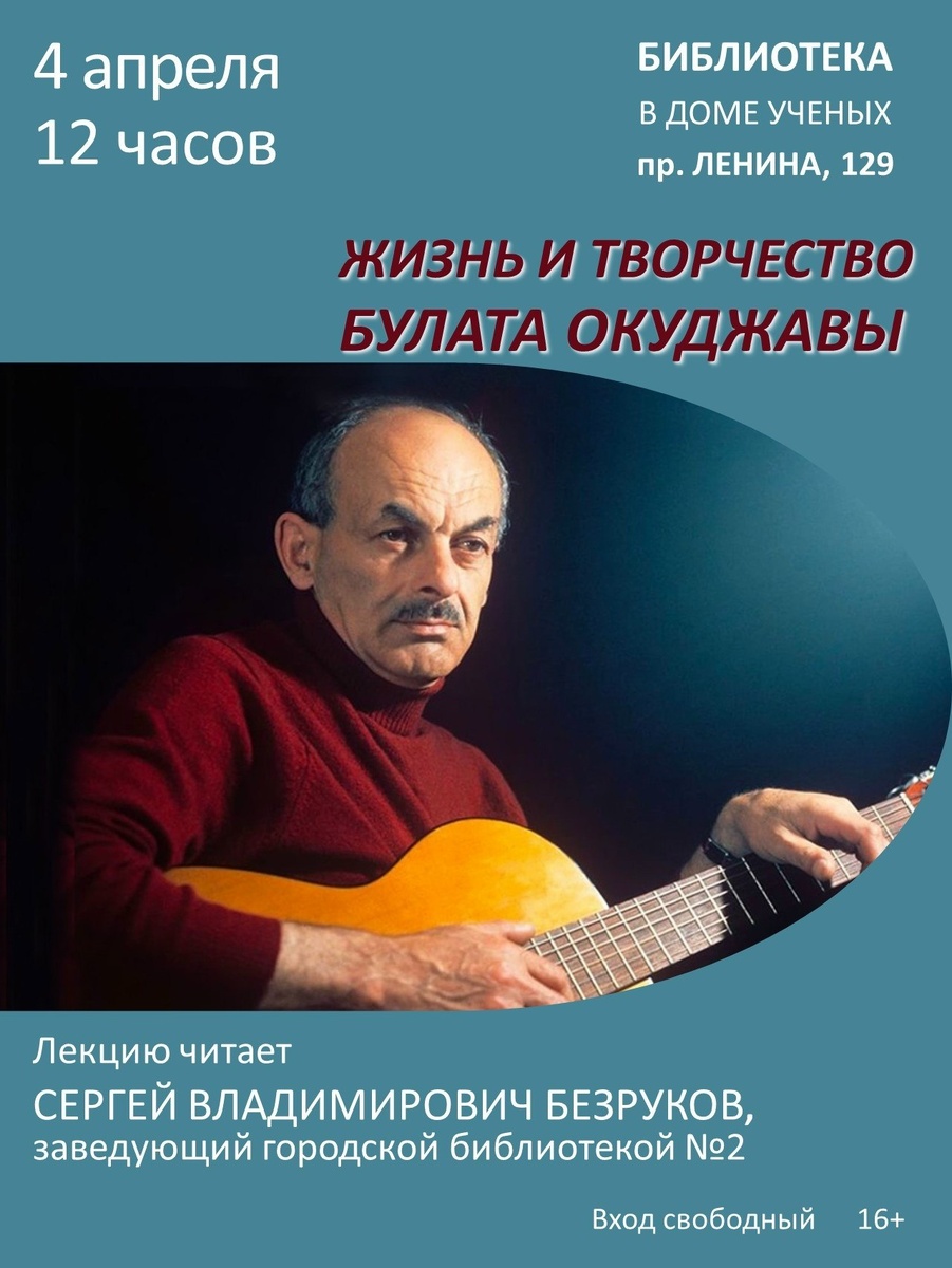 🗣️ 4 апреля в 12:00 в библиотеке №7 в Доме учёных состоится лекция «Жизнь и творчество Булата Окуджавы