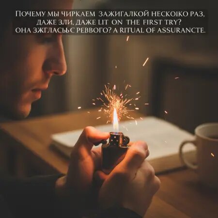Второй щелчок зажигалки — это не бессмыслица. Это диалог с собственной тревожностью. Мы проверяем не огонь, а себя: "Всё под контролем? Да. Ещё раз? Да". И только после этого можно курить, зажигать свечу или просто выдохнуть. Заключительная строка: