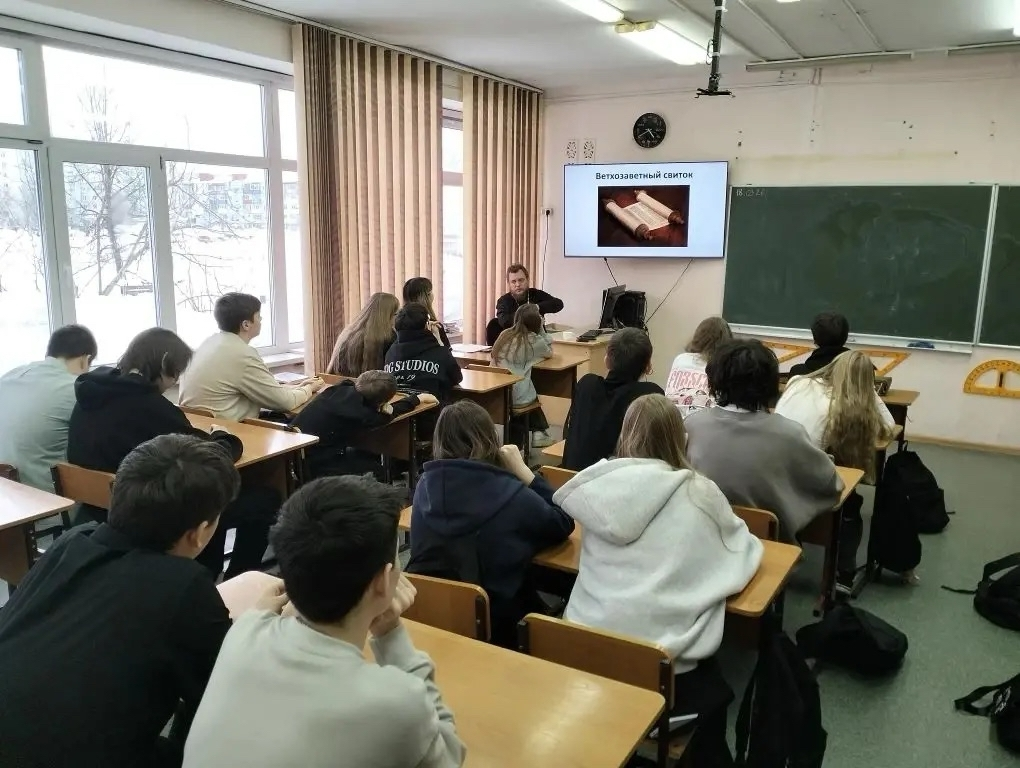 19 марта 2026 года в МБОУ «СОШ №26» города Междуреченска состоялись духовно-нравственные занятия для учащихся 8–10 классов в рамках предмета «Разговор о духовном». Со школьниками встретился старший преподаватель Кузбасской православной духовной семинарии, кандидат богословия иерей Роман Алексеевский. За один день было проведено семь отдельных занятий: для пяти восьмых классов и двух десятых классов. Тема занятий: «К истокам русского книгопечатания». Во время общения с учащимися затрагивались вопросы духовных ценностей, нравственного выбора, ответственности человека перед Богом и обществом, а также значения веры в жизни современного человека.