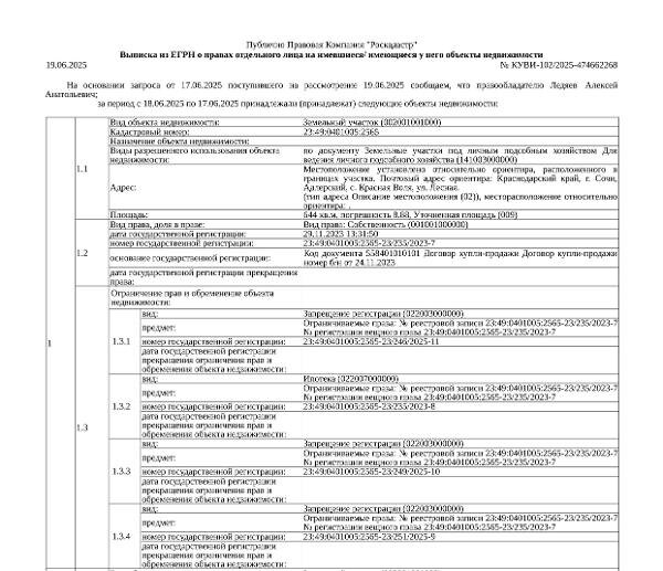 А. Земельный участок (для ведения личного подсобного хозяйства), площадь 644 +/– 8,88 кв.м., кадастровый номер 23:49:0401005:2565. Адрес: Краснодарский край, г. Сочи, с. Красная Воля, ул. Лесная. Начальная цена 4 421 360 руб., задаток 4 422 руб., шаг аукциона 44 214 руб., ув. 69 Канал: Госземля Краснодарский край Область: край Краснодарский г. Сочи Район: с. Красная Воля Населенный пункт: ул. Лесная Локация: Смотреть на карте ВРИ: Для ведения личного подсобного хозяйства (приусадебный земельный участок) Кадастровый номер: 23:49:0401005:2565 Кадастровая стоимость: - Вид сделки: Продажа Площадь: 644 м² Начальная цена: 4421360.00 руб. Дата завершения: 17.04.2026 Подробнее: ГИС ТОРГИ #госземля #земляотгосударства #земля #земельныйучасток #земельныеторги #торги #аукцион #продажаземли #продажа #краснодарскийкрай