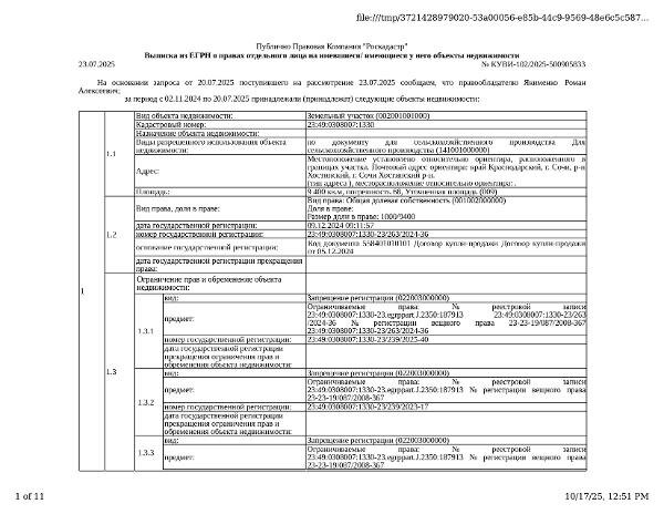 А. 1800/9400 долей в праве общей долевой собственности на земельный участок (для сельскохозяйственного производства), площадь 9400 кв.м., кадастровый номер 23:49:0308007:1330. Адрес: Краснодарский край, г. Сочи, Хостинский район. Начальная цена 4 994 000 руб., задаток 749 100 руб., шаг аукциона 49 940 руб., ув. 75 Канал: Госземля Краснодарский край Область: - Район: - Населенный пункт: - Локация: Смотреть на карте ВРИ: Сельскохозяйственное использование Кадастровый номер: 23:49:0308007:1330 Кадастровая стоимость: - Вид сделки: Продажа Площадь: 9400 м² Начальная цена: 4994000.00 руб. Дата завершения: 27.04.2026 Подробнее: ГИС ТОРГИ #госземля #земляотгосударства #земля #земельныйучасток #земельныеторги #торги #аукцион #продажаземли #продажа #краснодарскийкрай