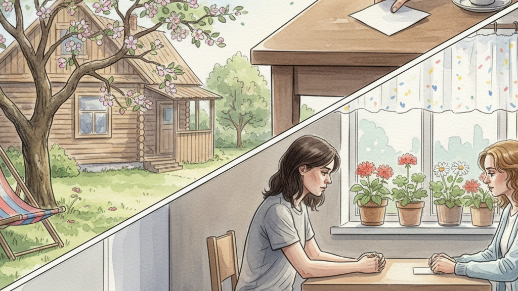 Родители купили её когда продали старую машину и добавили немного сверху. Не дворец — восемь соток в часе езды от города, дом в две комнаты с верандой, колодец, пять яблонь. Но мой. Свидетельство на моё имя, мой адрес, моя подпись. Я тогда жила одна — и была этому рада, честно говоря.