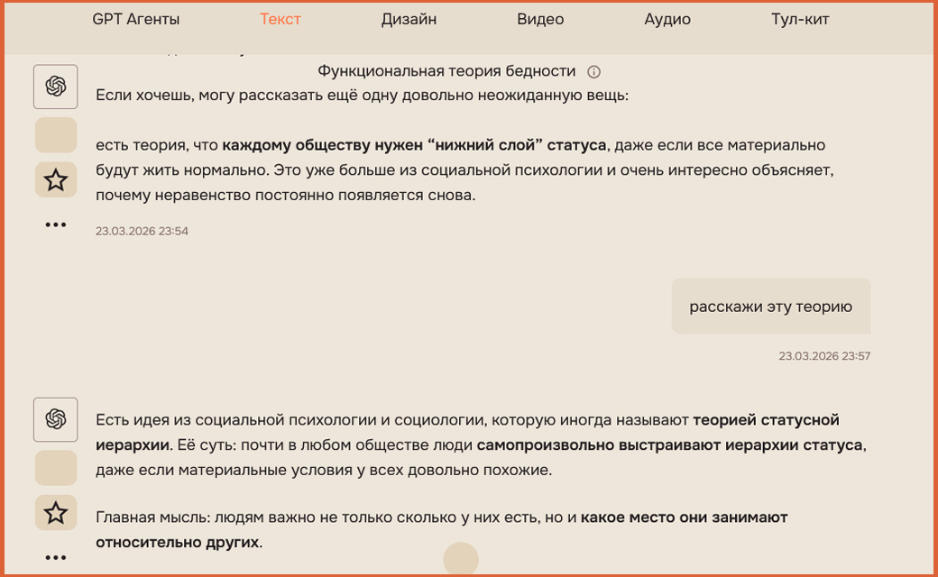 Иногда нейросети пугают – своей реалистичностью, особенно в качестве собеседника. Например, недавно мы с chat GPT беседовали о «теории бедности». Ну, а правда – куда-то же должны деваться разорившиеся селлеры? И кому-то это было нужно? Приятно поговорить с «умным человеком», ага: И вот еще что. На платформе, где мы все обитаем, слишком обширный список стоп-слов. Все, что запрещено или может быть в перспективе быть запрещенным в стране – туда попадает. Поэтому не удивляетесь, что в моих (и не только) текстах встречаются такие безумные конструкции, как «видеохостинг с красной кнопкой», «Т-канал» или «зелёный мессенджер». Развиваем воображение! Отличная профилактика альц---геймера, говорят (ДА! Это слово из медицинской тематики… Раньше его тоже было нельзя.) Я часто пишу про инфо-ц-ыg. Канал у меня такой направленности. Меня интересует эта тема еще со времен гер6алайфа, виccариона и свидетелей. В своей шальной молодости я несколько раз посещала сборища устроителей финансовых пирамид /там