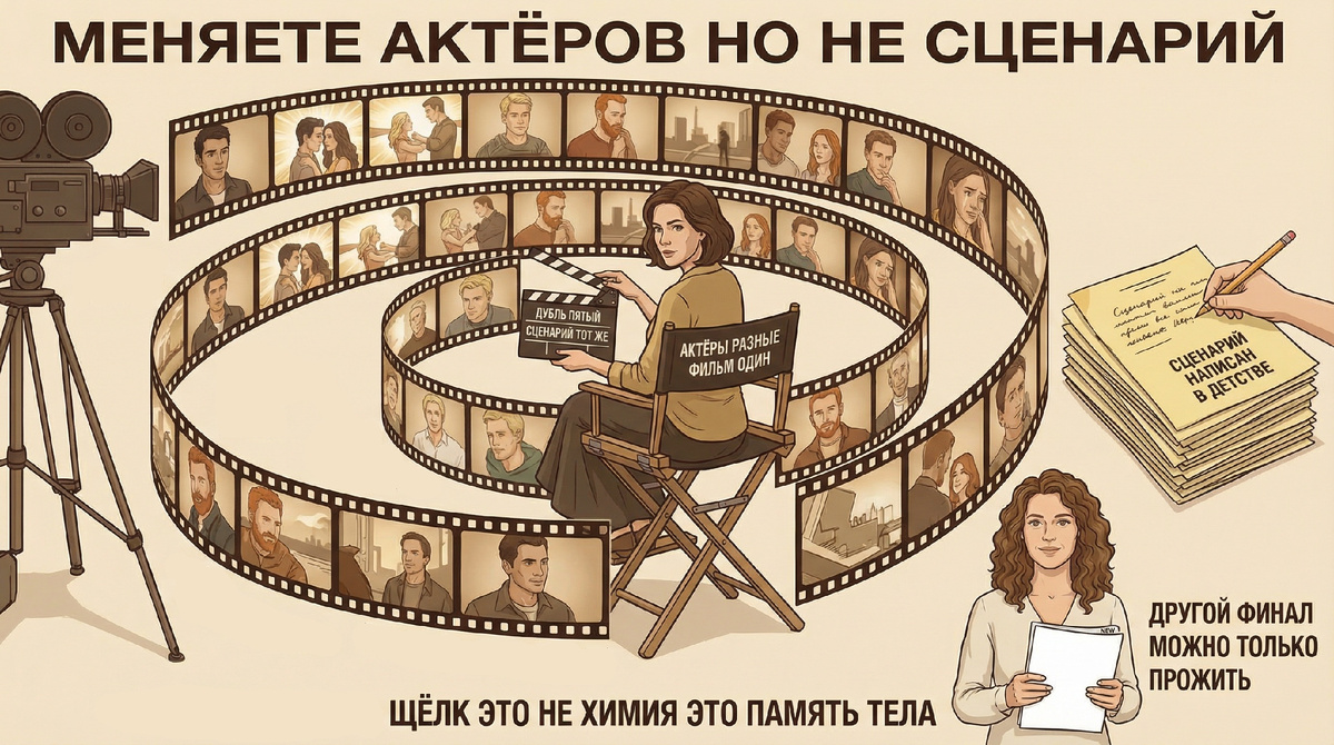 Потому что «следующий раз» — это не другая пьеса. Это тот же спектакль с новым составом. Вы меняете актёра — но режиссёр остаётся прежним. А режиссёр — это ваше бессознательное, которое кастинг проводит задолго до того, как вы осознаёте «выбор».