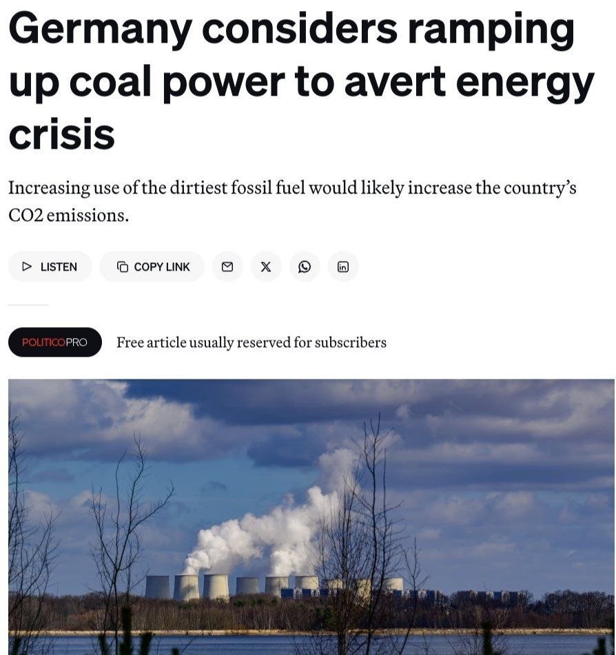 😏 Германия рассматривает возможность возобновления работы простаивающих угольных электростанций на фоне резкого роста цен на энергоносители. Цель — снизить зависимость от дорогостоящего природного газа и сохранить стабильность цен на электроэнергию. Источник: Politico Подписаться на канал | 📲 MAX Мы в ВКонтакте