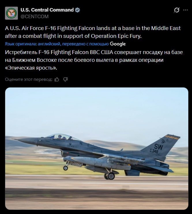 Истребитель F-16 ВВС США совершил аварийную посадку в Саудовской Аравии после получения повреждений, «в иранском воздушном пространстве», сообщает агентство Tasnim. Центральное командование США подтвердило факт посадки самолёта F-16 Fighting Falcon на одной из баз на Ближнем Востоке после боевого вылета в рамках операции «Эпическая ярость». Информации о повреждениях и пострадавших не приводится. Подпишись на БородинLIVE Новости