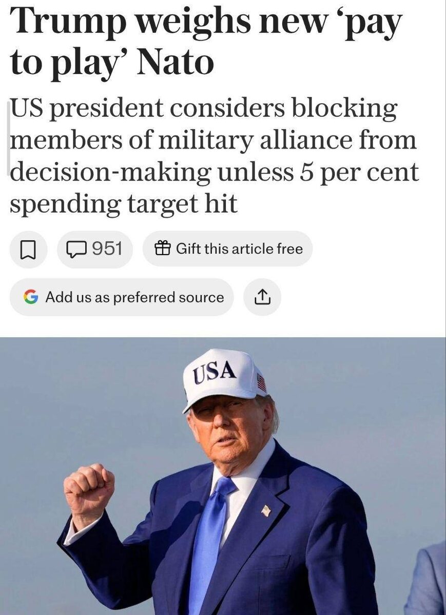 Трамп рассматривает реорганизацию НАТО. По данным The Telegraph, новая модель «плати, чтобы участвовать» позволит лишать союзников права принимать решения, если они не вносят 5% оборонных взносов. На днях Трамп уже пригрозил НАТО «плохим будущим», если союзники не помогут США разблокировать Ормузский пролив. НАТО теперь не «щит демократии», а платный паркинг. 🚲 Подпишись на Телега Online