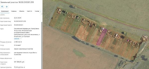 м. с кадастровым номером 16:28:030301:255, расположенный по адресу: Республика Татарстан, Мензелинский муниципальный район, Бикбуловское сельское поселение, п. Ахматовка, ул. Луговая, для ведения личного подсобного хозяйства Канал: Госземля Республика Татарстан Область: Респ Татарстан Район: м.р-н Мензелинский Населенный пункт: с.п. Бикбуловское, п Ахматовка, ул Луговая Локация: Смотреть на карте ВРИ: Для ведения личного подсобного хозяйства (приусадебный земельный участок) Кадастровый номер: 16:28:030301:255 Кадастровая стоимость: - Вид сделки: Аренда Площадь: 2490 м² Начальная цена: - руб. Дата завершения: 28.04.2026 Подробнее: ГИС ТОРГИ #госземля #земляотгосударства #земля #земельныйучасток #земельныеторги #торги #аукцион #арендаземли #аренда #республикататарстан
