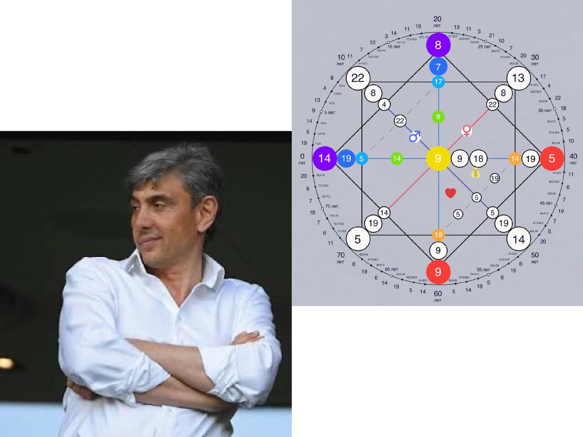 Российский предприниматель, общественный деятель, основатель розничной сети «Магнит» и президент футбольного клуба «Краснодар». Сегодня заглянем в матрицу Сергея Галицкого -по которой явно видно, что человек пришел не просто «быть богатым», а строить богатство как фундамент для чего-то более значимого. Восьмёрка в точке главного таланта — буквально «заряжена» на масштабные финансовые проекты и в плюсовом проявлении характеризует ее обладателя ка прирождённого управленца,мощного стратега, способного выстраивать бизнес-империи. В матрице прослеживается повторяющаяся много раз пятерка — это энергия наставничества, системы знаний, традиций и образования. В плюсе — человек, который не только сам учится всю жизнь, но и создаёт системы для обучения других. Это ярко проявилось в страсти Галицкого к футбольной академии «Краснодар» Девятка в центре матрицы говорит о глубинной мудрости, стремлении к познанию сути вещей и определённой закрытости. Галицкий — не публичный шоумен, а скорее ч