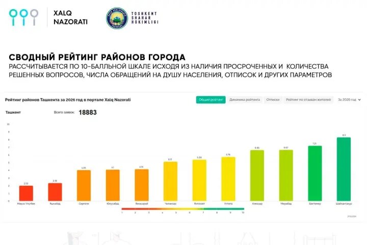В пресс-службе хокимията города Ташкента сообщили, что по состоянию на 27 марта через платформу "Xalq nazorati" поступило 18 883 обращения. По данным ведомства, только за текущую неделю по столице принято 1 677 сообщений, что отражает продолжающуюся активность жителей в использовании цифрового механизма обратной связи для фиксации городских проблем и направления их в адрес ответственных структур.