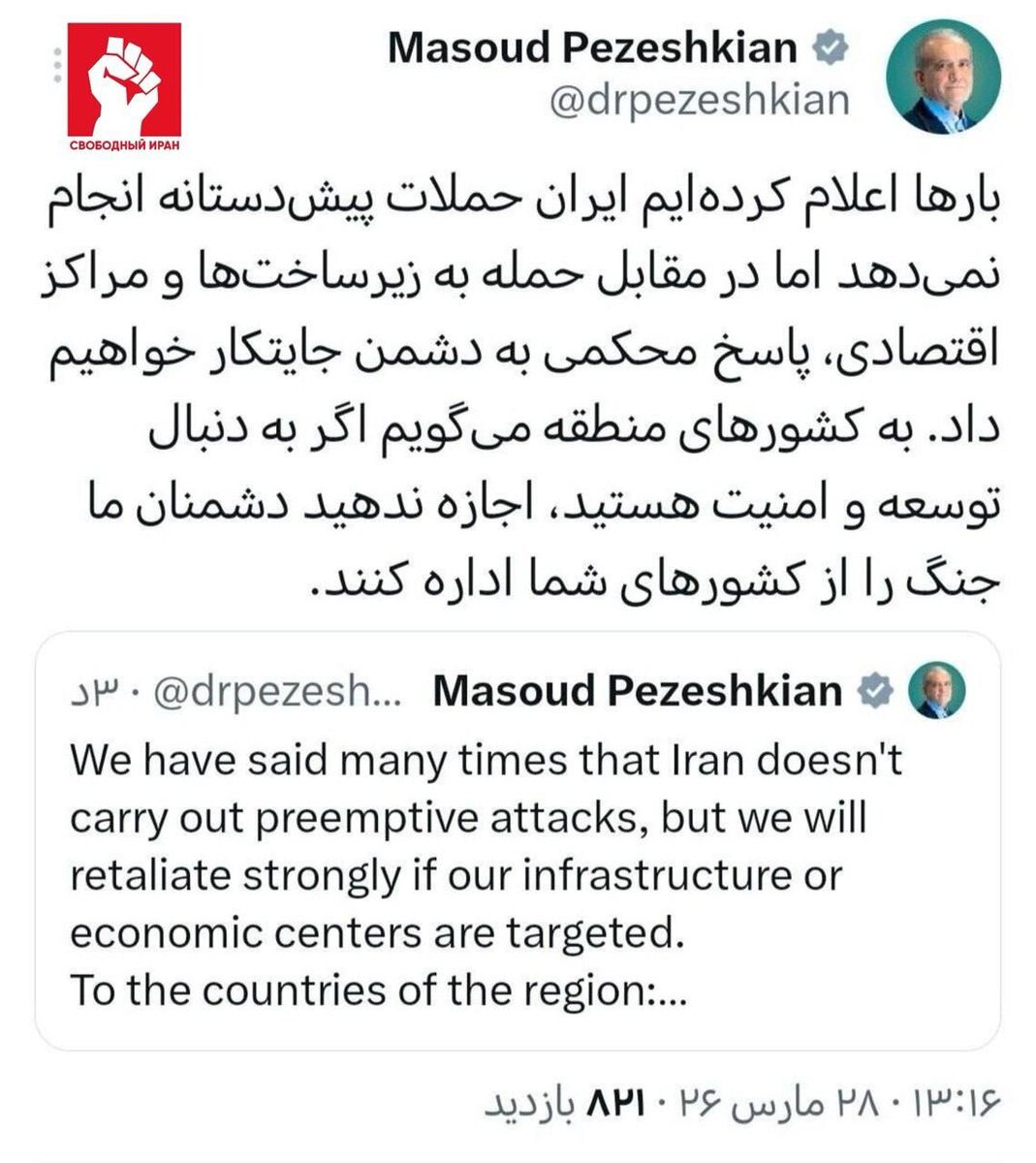 🚨 Иран не наносит упреждающих ударов, но в случае атак по инфраструктуре и экономическим объектам даст решительный ответ, заявил президент Масуд Пезешкиан. Он также призвал страны региона не позволять противникам Ирана вести войну с их территории. Подпишитесь на канал