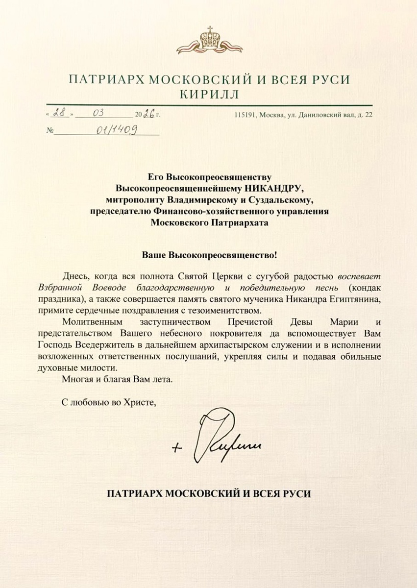 : Ваше Высокопреосвященство! Днесь, когда вся полнота Святой Церкви с сугубой радостью воспевает Взбранной Воеводе благодарственную и победительную песнь (кондак праздника), а также совершается память святого мученика Никандра Египтянина, примите сердечные поздравления с тезоименитством. Молитвенным заступничеством Пречистой Девы Марии и предстательством Вашего небесного покровителя да споспешествует Вам Господь Вседержитель в дальнейшем архипастырском служении и в исполнении возложенных ответственных послушаний, укрепляя силы и подавая обильные духовные милости. Многая и благая Вам лета! С любовью во Христе Святейший Патриарх Московский и всея Руси Кирилл.