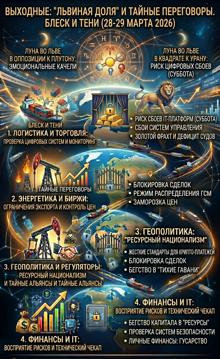 Логистика и IT: В субботу возможен «цифровой бунт». Луна во Льве в квадрате к Урану — это риск того, что системы безопасности или софт для мониторинга грузов выдадут ошибку просто потому, что кто-то решил «обновиться» в самый неподходящий момент. Если у тебя есть критические процессы, которые работают в выходные — проверь их в субботу утром, чтобы в воскресенье не бегать с горящей головой.