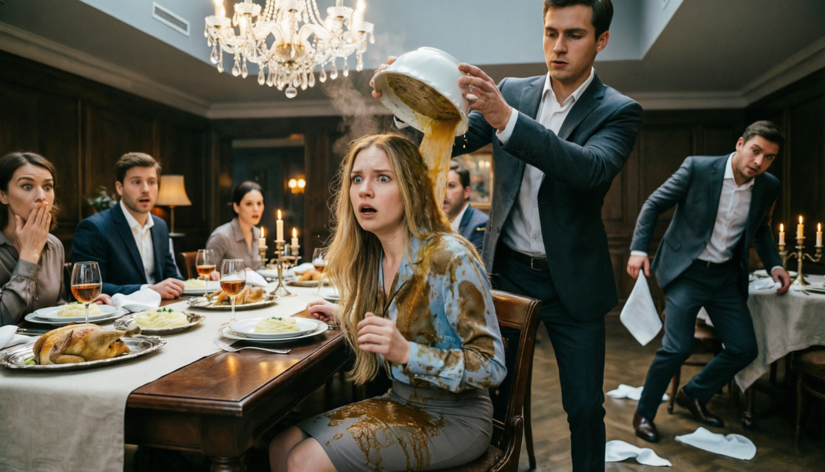 Горячая оранжевая жидкость хлынула вниз, заливая её идеальную прическу, стекая по лицу, шее, пропитывая дорогое изумрудное платье. Капли супа брызнули на соседей. В зале повисла мертвая тишина, нарушаемая лишь тихим стуком падающей ложки, которую Алиса выпустила из рук.
