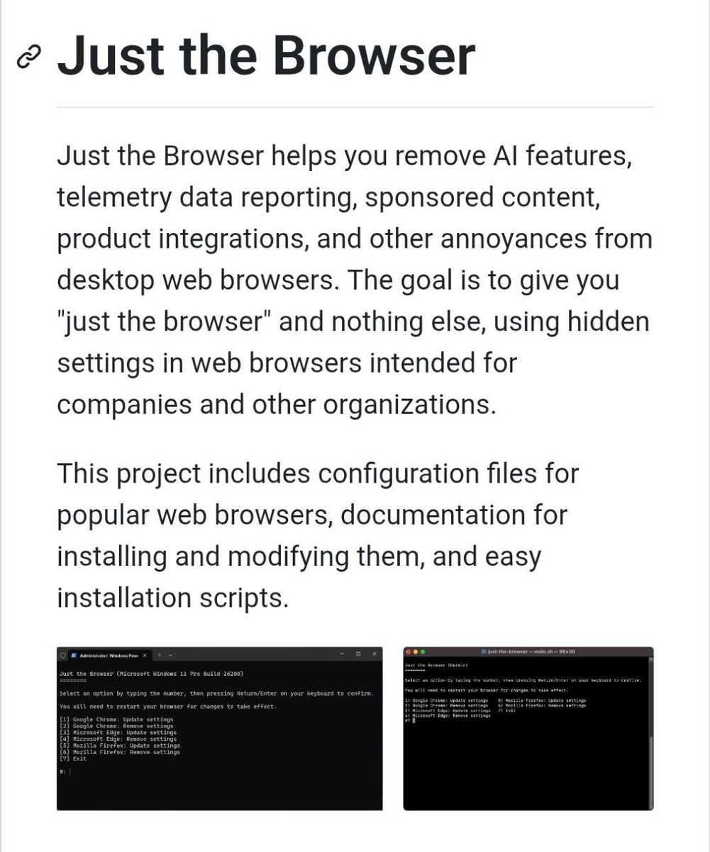Один разраб сделал незаменимый инструмент для уборки Chrome, Firefox и Edge. Программа влезает в политику, СКРЫТУЮ от юзера, и наводит там порядок. Никаких лишних модификаций: просто настойка браузера через реестр и JSON-конфиги. Вырезает: 🔅 Телеметрию и слив данных; 🔅 Рекламу, купоны, шоппинг-трекеры; 🔅 Спонсорский мусор на каждой вкладке; 🔅 Бесконечные «сделать по умолчанию». Заставляем браузер работать нормально и не съедать всю оперативу тут.