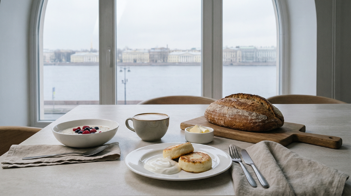 Петербургский завтрак почти всегда хочется сделать не кричащим, а собранным. Не грубым и слишком деревенским, но и не выхолощенно-отельным. В нём хорошо работает тонкая эстетика: красивый хлеб, масло, каша, джем, фарфор или стекло, спокойная подача, немного истории и ощущение, что утро здесь — это не гонка, а культурная пауза. Это уже мой практический вывод из исторических материалов и современных фестивальных интерпретаций.