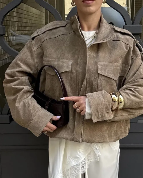 Замшевые куртки. Это абсолютный хит сезона. Самым актуальным вариантом считается объёмный бомбер. Здесь работает правило «чем больше, тем лучше». Мягкая замша плохо держит жёсткую форму, поэтому куртка будет красиво собираться в складки, создавая расслабленный и стильный силуэт. Для тех, кто предпочитает более элегантный стиль, подойдут