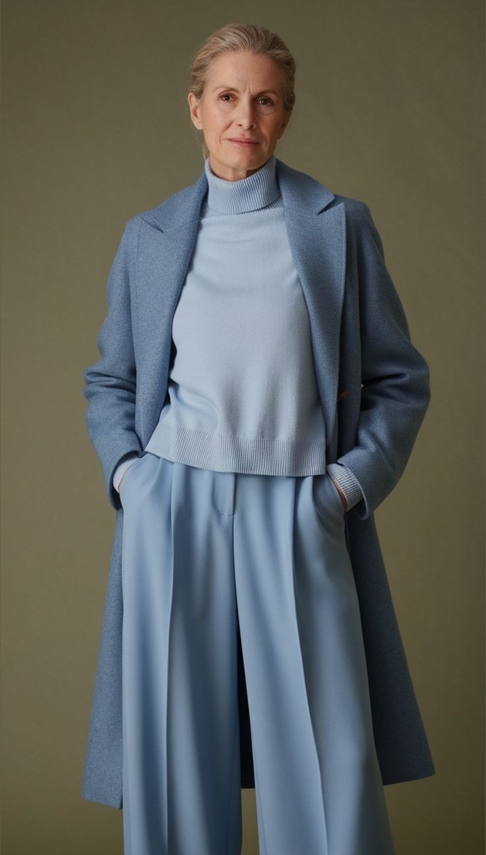 - Элегантный образ, который привлекает внимание окружающих и визуально омолаживает женщину. Основные элементы – широкие небесно-голубые брюки со стрелками и тонкая водолазка на пару тонов светлее брюк. Если на улице еще прохладно, то стоит накинуть серо-голубое пальто длиной до колен или чуть ниже.
