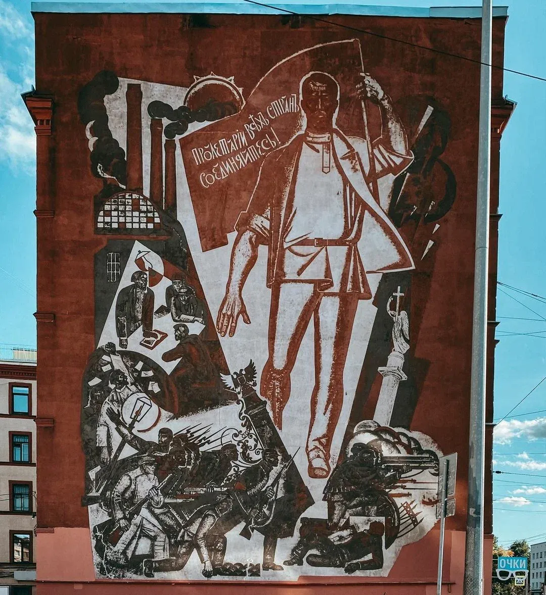 В Петербурге у метро Нарвская есть революционное панно. Сюжет: крепкий мужик с багровым лицом и флагом-косой в руках уничтожает Россию. Рушащаяся от его могучей поступи Россия представлена в виде двух оскверняемых символов: двуглавого орла и ангела с крестом.